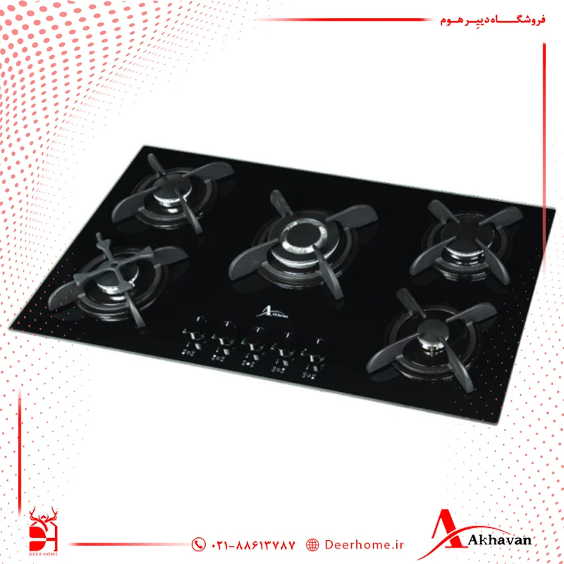 - طراحی شیک و مدرن: گاز رومیزی 5 شعله Gi144-NP اخوان از شیشه سکوریت مشکی رنگ ساخته شده و نمای شیک و مدرنی دارد.